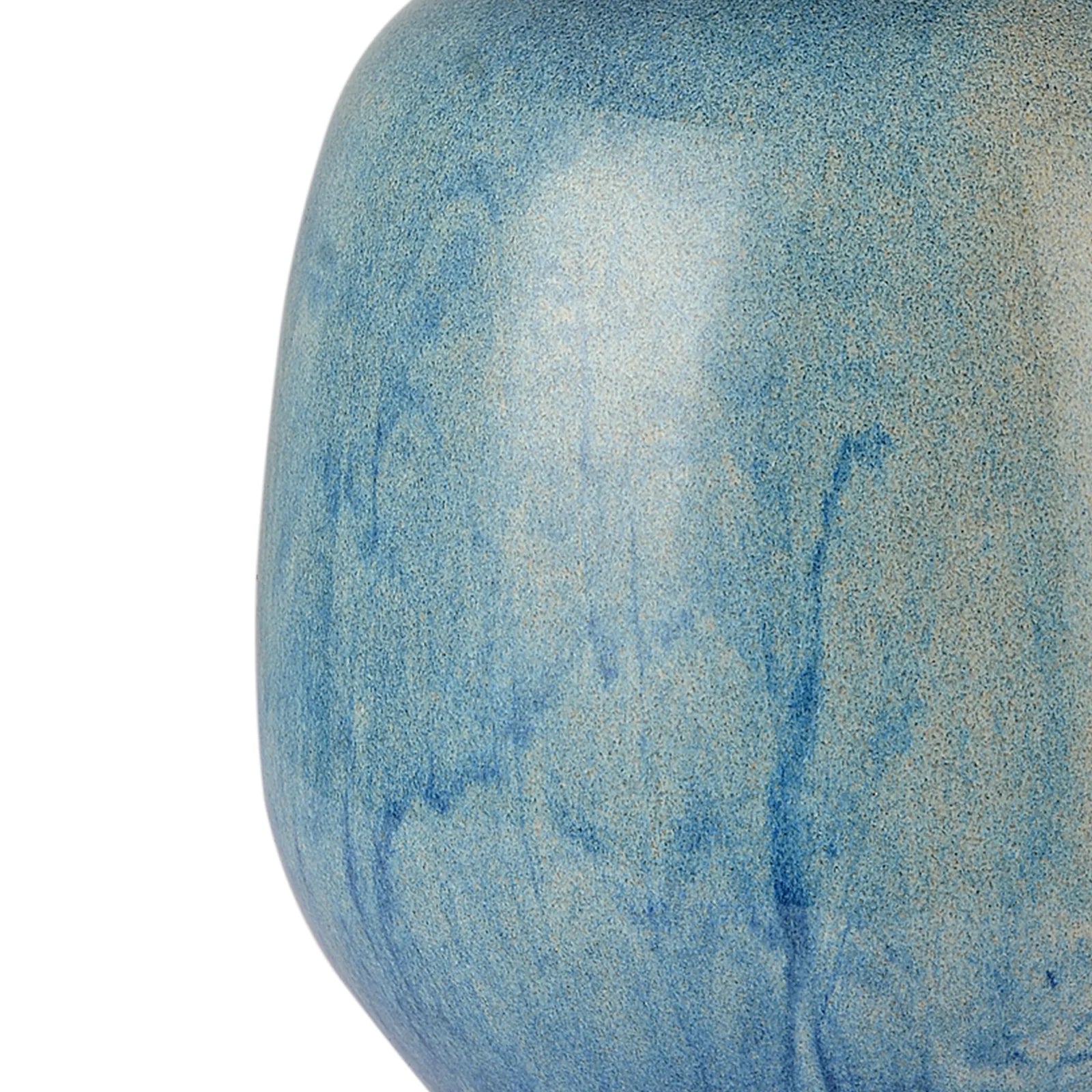 Crafted from sturdy ceramic, this table lamp features gently curved contours, a rounded body, and a narrow neck, topped with a textured linen white drum shade and a teal ceramic finial. This creates a harmonious silhouette that adds sophistication and comfort to any room.